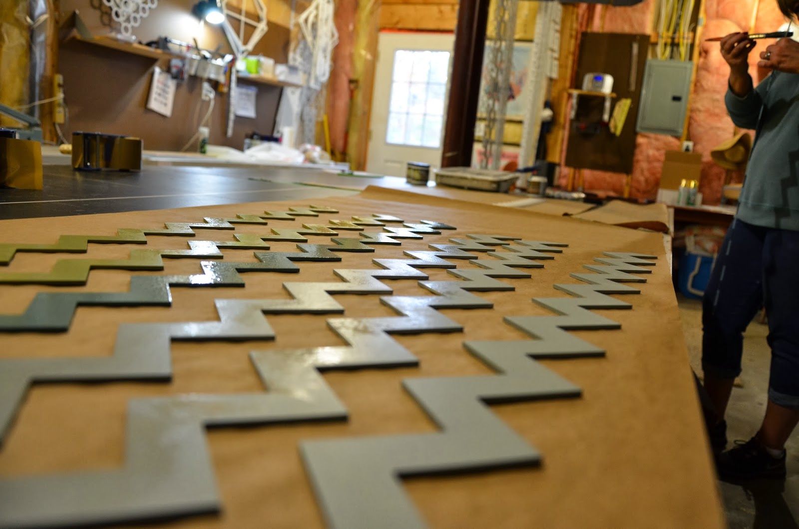 As the dresser paint dried, we got to work on the O'verlays. Drawing from the palette in our inspiration photo, we chose an assortment of colors. We used Behr Ultra paint from Home Depot in matte shades of "Mother Nature" (Green), "Hallowed Hush" (Blue), and "Flint Smoke (Grey). Each strip of Zia was painted and arranged in a pattern of alternating colors. Always check the paint label for instructions and drying times.
